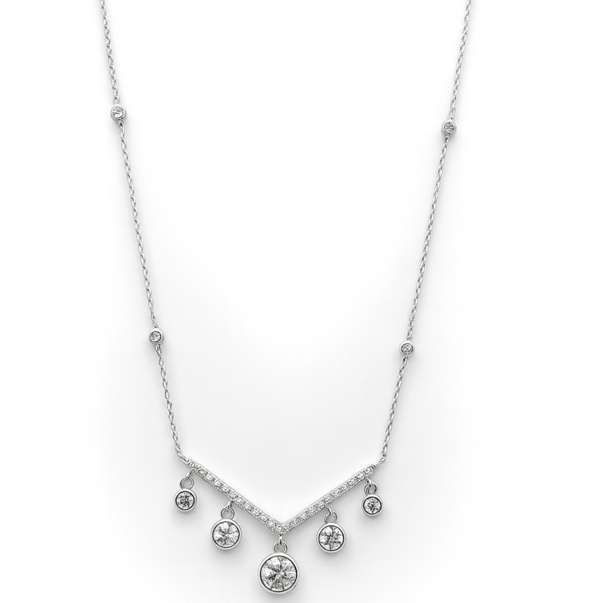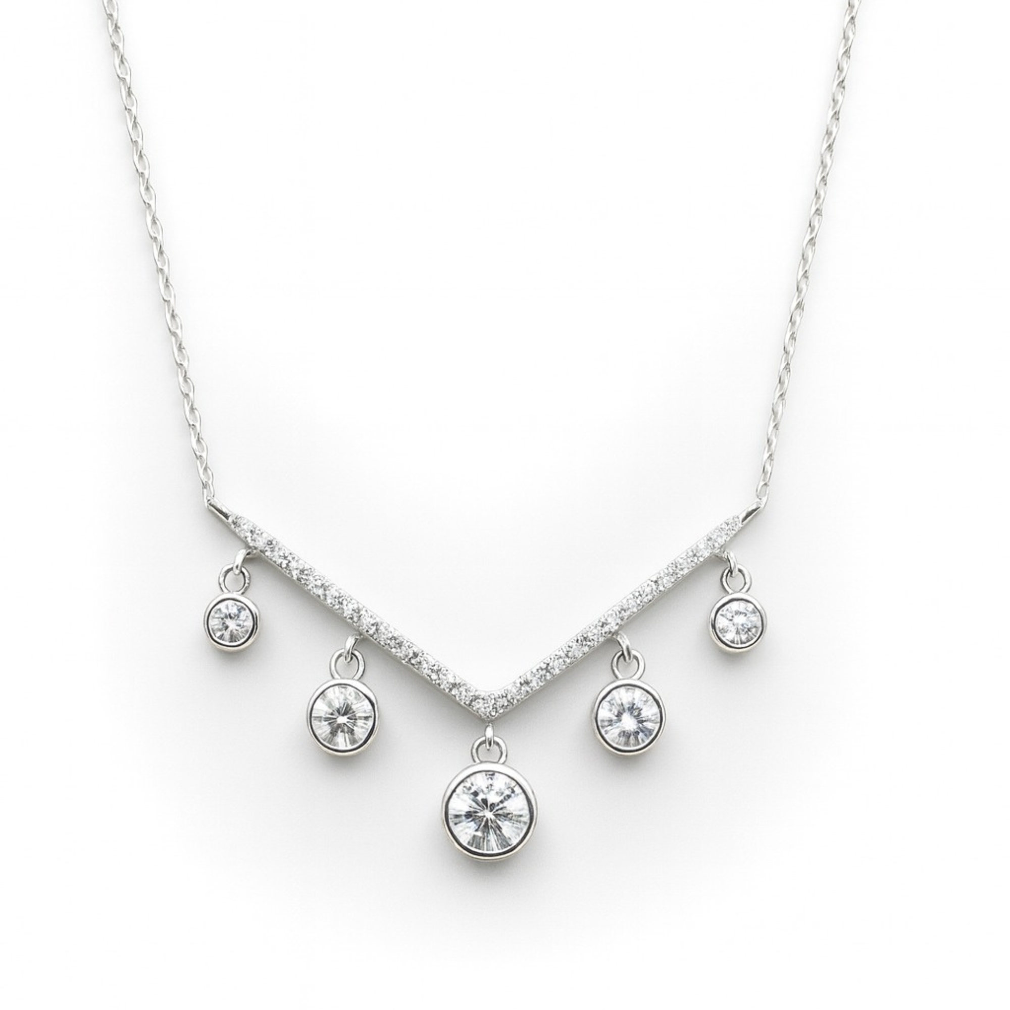 Luxury V-Shape Sterling Silver Necklace with Shimmering CZ Drops