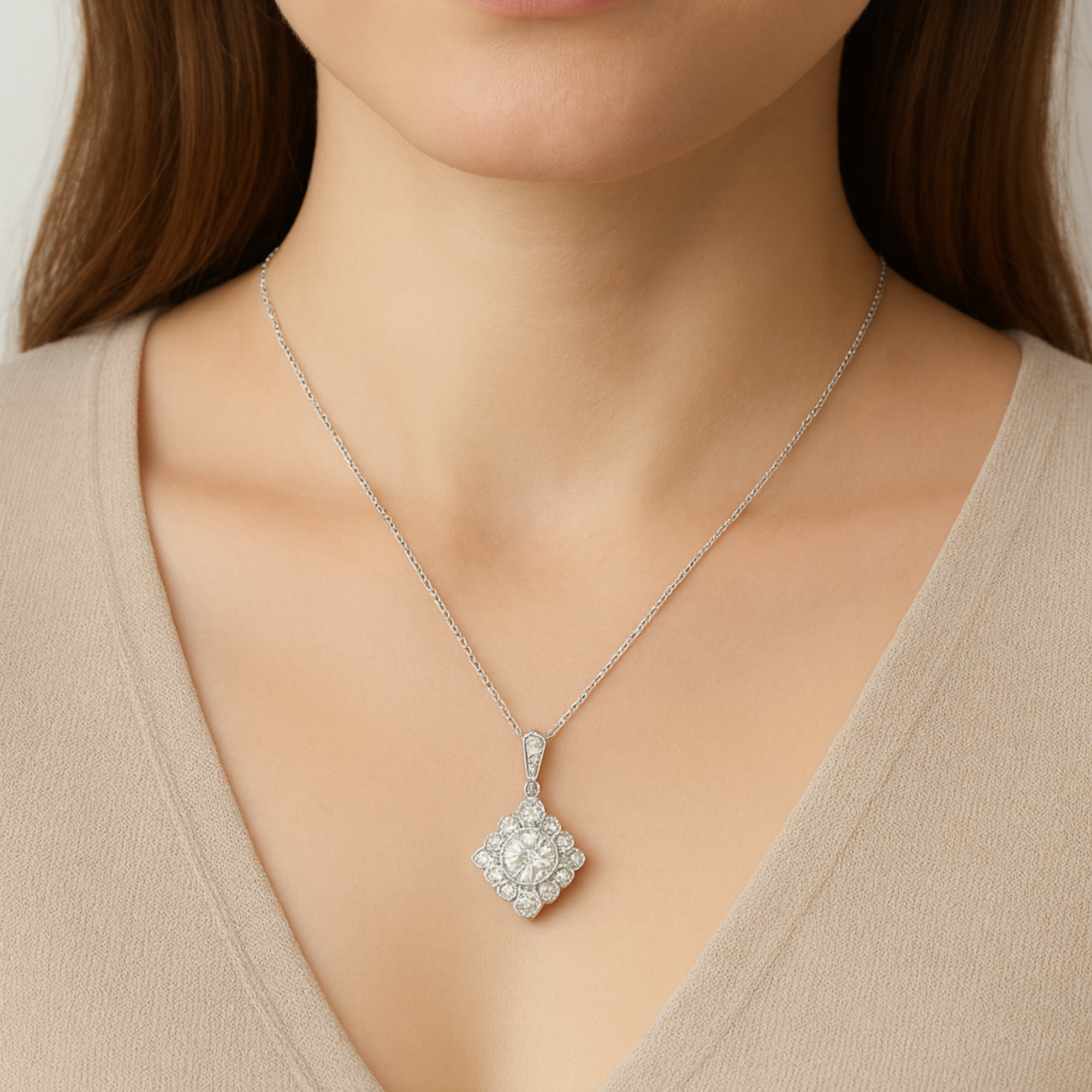 Floral Cluster Diamond Pendant 925 Silver Necklace