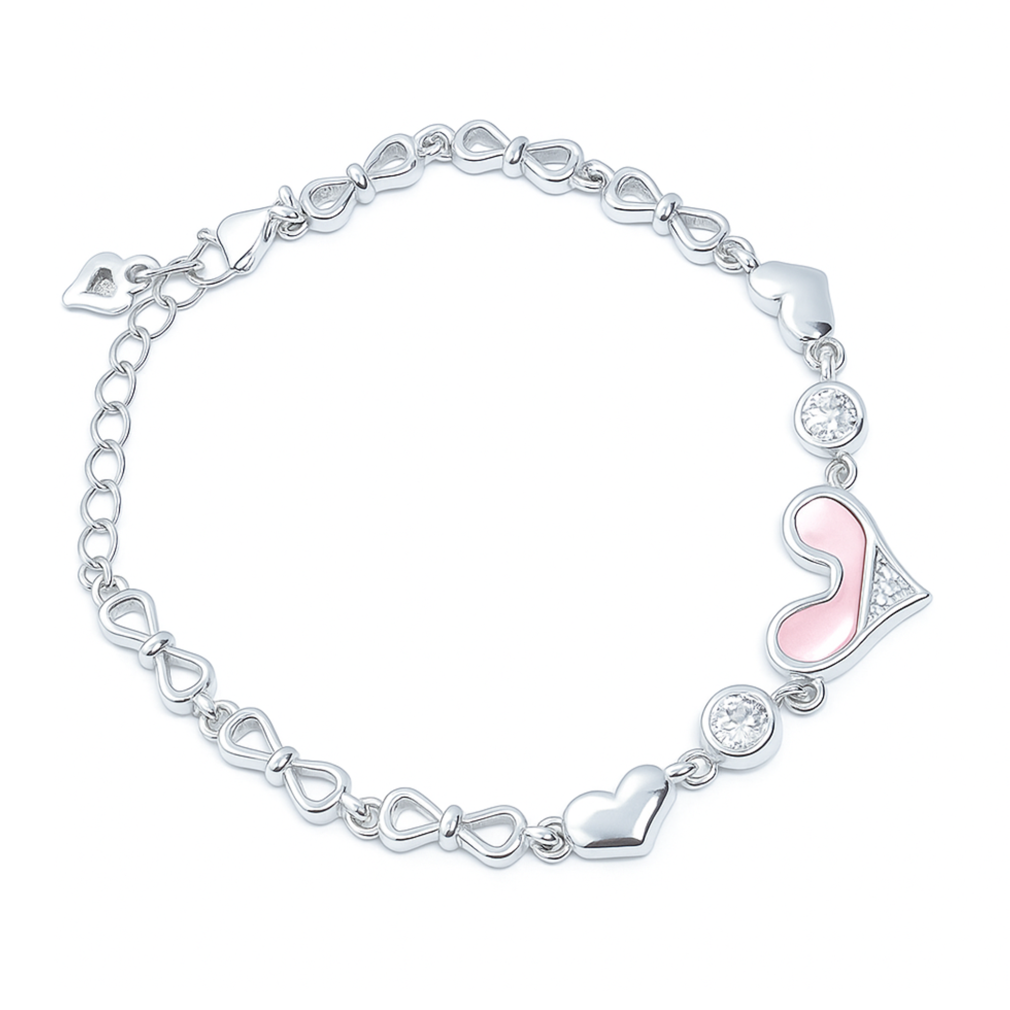 Stylish Silver Heart & Bow Bracelet for Women – Cute Charm Bracelet with Pink Enamel & Zircon Stones