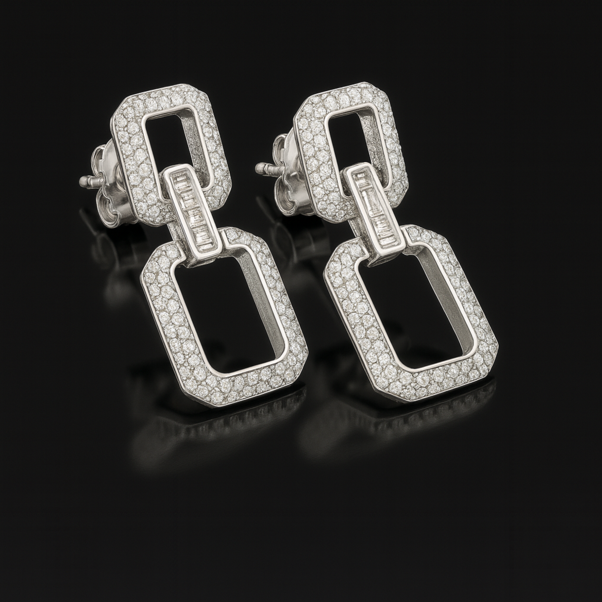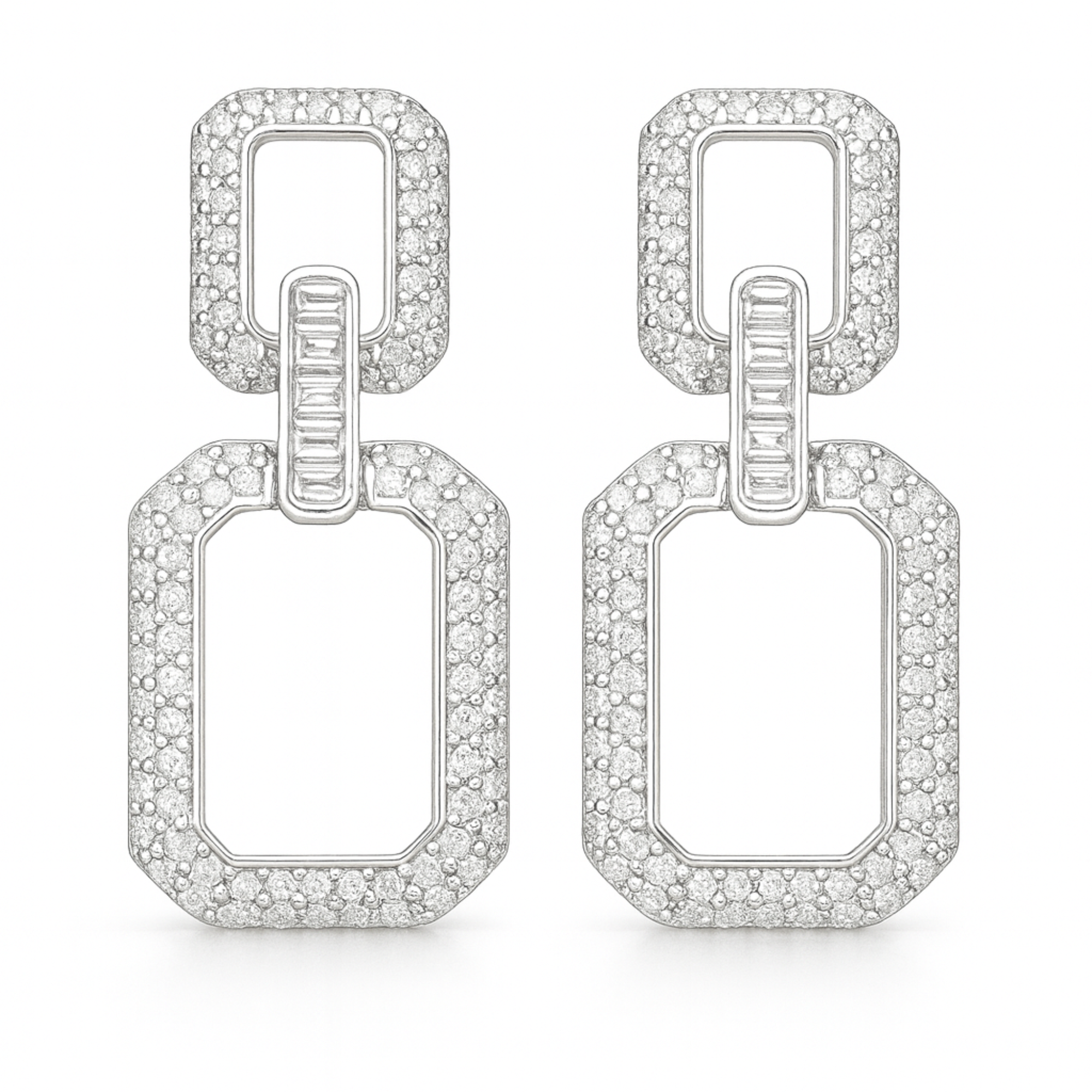 silver Modern Rectangular Link Drop Earrings with Sparkling Pave diamond