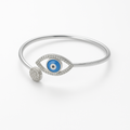 Protect your style and spirit with this Elegant Evil Eye Silver Kada, a sleek and modern open cuff bracelet crafted for the contemporary fashionista. Designed in polished sterling silver, this bracelet features a prominent blue evil eye centerpiece, framed with sparkling pave-set cubic zirconia in a sleek marquise (eye-shaped) design, believed to ward off negative energy and attract good fortune.